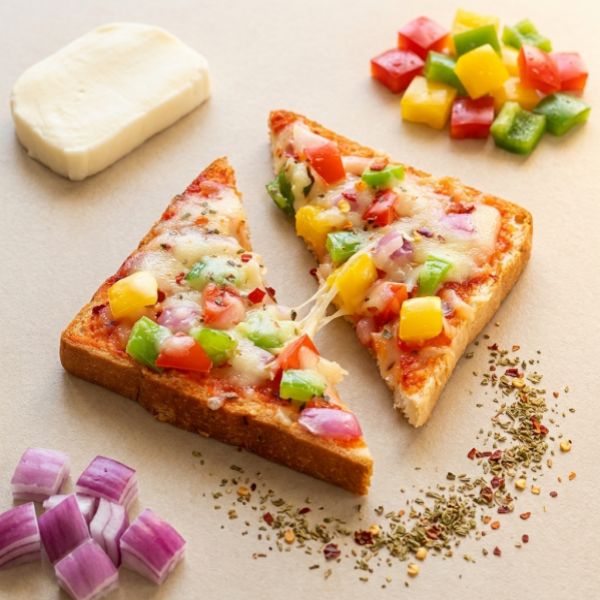 The recipe made with whole grain bread, tomato pizza sauce, cheese and veggies.